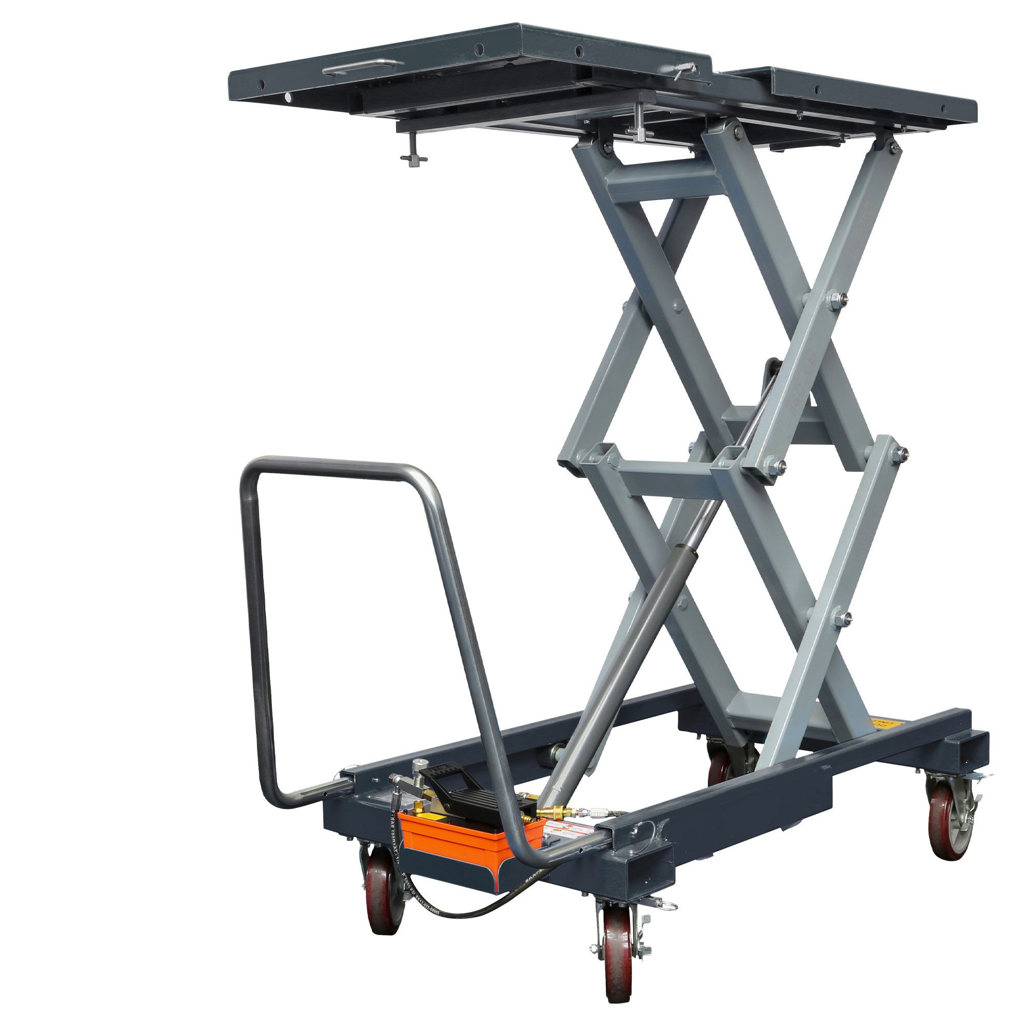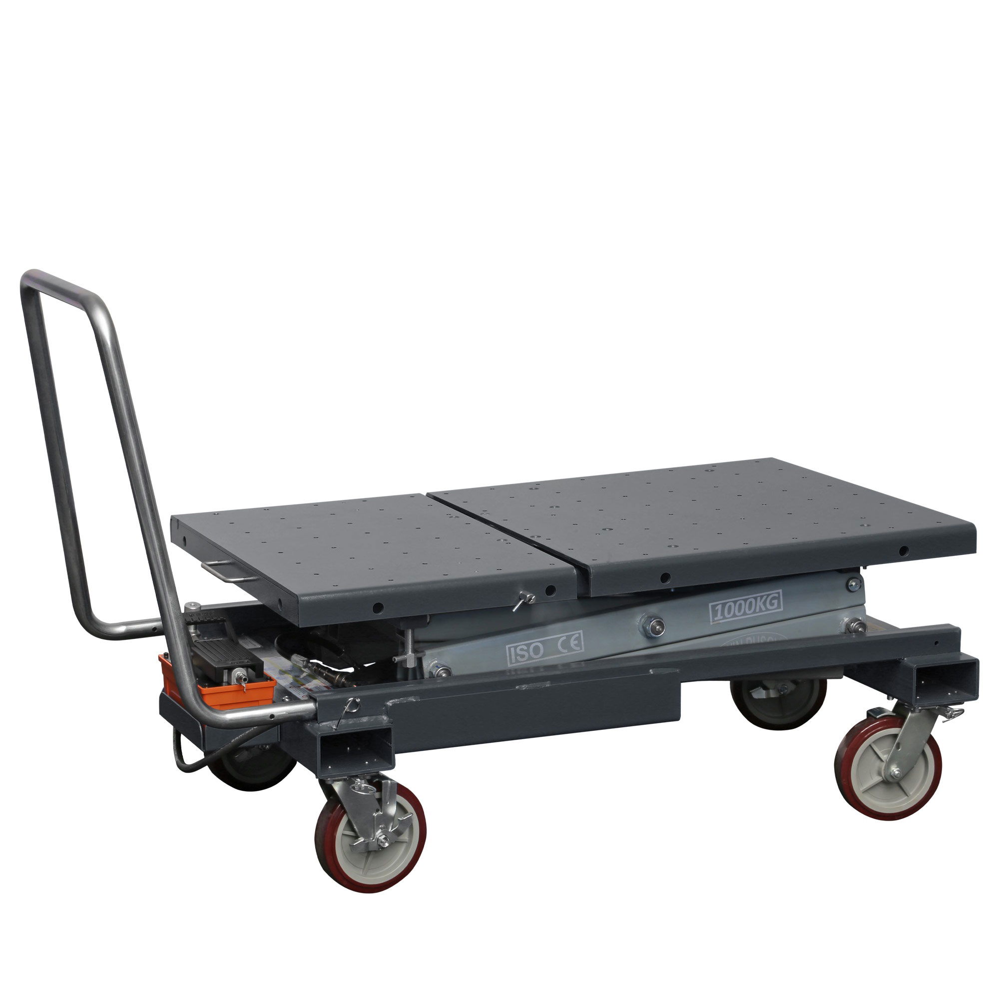 This lifting table is perfect for disassembly & assembly of vehicle components such as axle, engine, transmission and the EV vehicle battery. The scissor lift table is steerable with a lifting drawbar and equipped with two heavy-duty castors, making it very mobile and maneuverable. Additionally 2-fold adjustable and removable push handle.